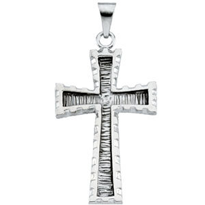 14K Gold Cross pendant with bark finish 30x20 mm. This cross is available in either 14K yellow or white gold.